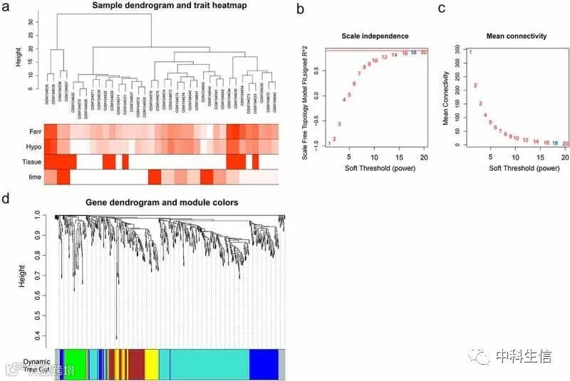 应用Pearson相关系数对样本进行聚类,得到样本聚类树如图3a所示。选择软阈值18(基于R2=0.9的无标度拓扑标准)以获得无标度网络(图3b,c)。最后得到6个模块(图3d)。