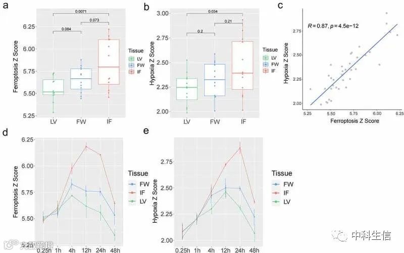 根据铁死亡和缺氧相关基因的表达,使用ssGSEA计算每个样品的铁死亡评分和缺氧评分。结果显示,AMI小鼠IF的铁死亡评分(图2a)和缺氧评分(图2b)显着高于对照小鼠的LV。铁死亡评分与缺氧评分之间存在显着的正相关(图2c)。从时间上看,IF组铁死亡评分从1h开始增加,12h达到峰值,24h后开始下降(图2d),而缺氧评分从1h开始增加,24h达到峰值,然后下降(图2e)。