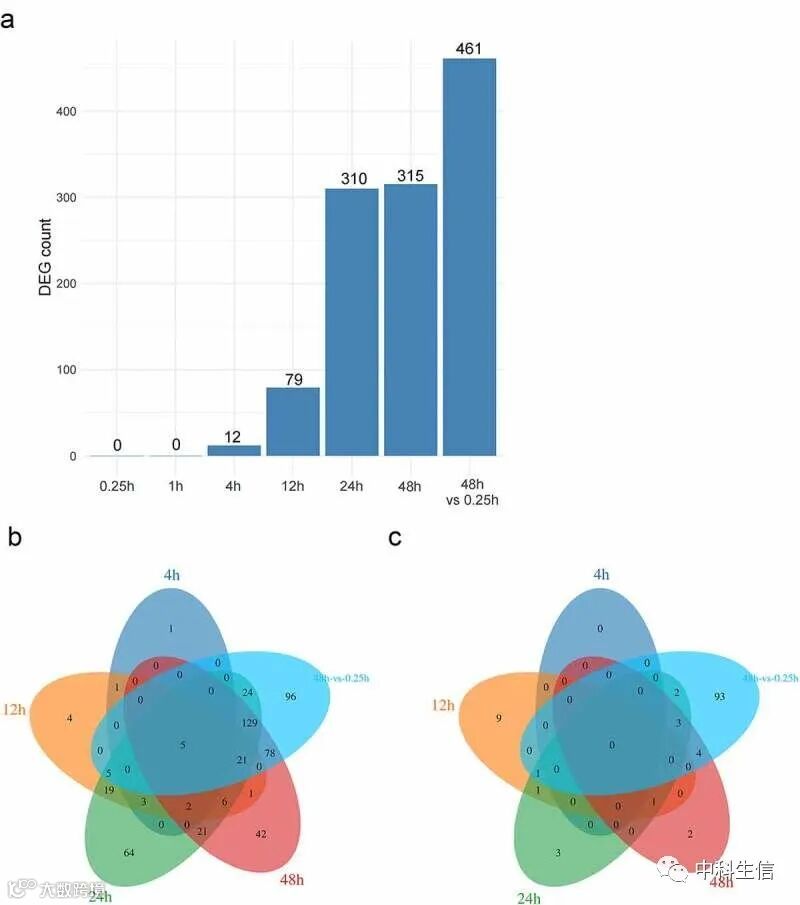 使用维恩图分析急性心肌梗死(AMI)后不同时间段的上调基因和下调基因(IF VS LV,图1a)。共有641个DEG,其中上调基因522个(图1b),下调基因119个(图1c)。