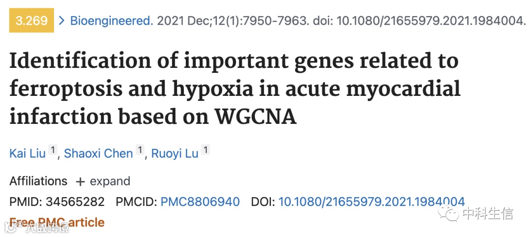 早上好,今天分享一篇2021年10月发表在Bioengineered(IF=3.269)的文章(Ref: 34565282),作者研究的是急性心肌梗死中铁死亡和缺氧相关hub基因的鉴定。该研究方法同样适用于其他肿瘤或非肿瘤常见病的研究,有相关需求的老师欢迎联系我们!
