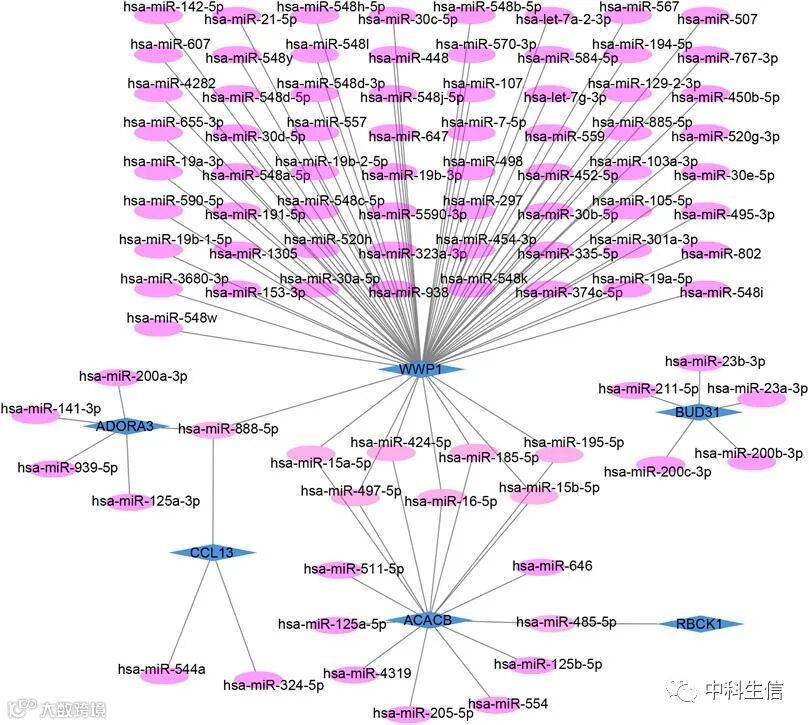 使用mirDIP数据库预测上述6个关键基因的miRNA,共101个miRNA,生成了102个miRNA-mRNA关系对(Fig 6)。使用starBase3.0预测与选定miRNA相互作用的lncRNA,最终生成了ceRNA网络(Fig 7)。