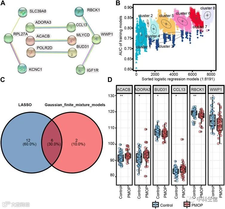 通过逻辑回归分析了12个模型基因的表达值与PMOP分析中筛选的AUC值之间的相关性。12个mRNA的逻辑回归模型产生了8191个公式。接下来,使用基于GMM的决定性聚类,将基因聚为8个簇,选择AUC最高的簇作为预测PMOP发生的特征基因(Fig 5B)。将LASSO和GMM获得的共同基因作为关键基因,共6个(Fig 5C)。其中