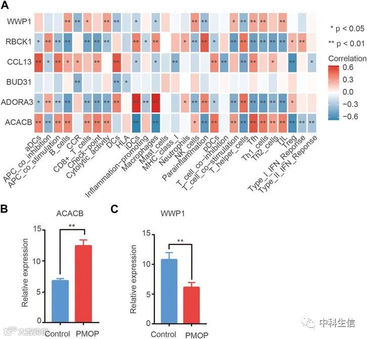 的水平与B细胞、NK细胞呈正相关,ADORA39的水平与巨噬细胞、T辅助细胞呈正相关。相反,RBCK1的水平与Th1/Th2细胞呈负相关(Fig 8A)。因此,枢纽基因可能在免疫细胞的功能中发挥重要作用。此外,采用qPCR检测