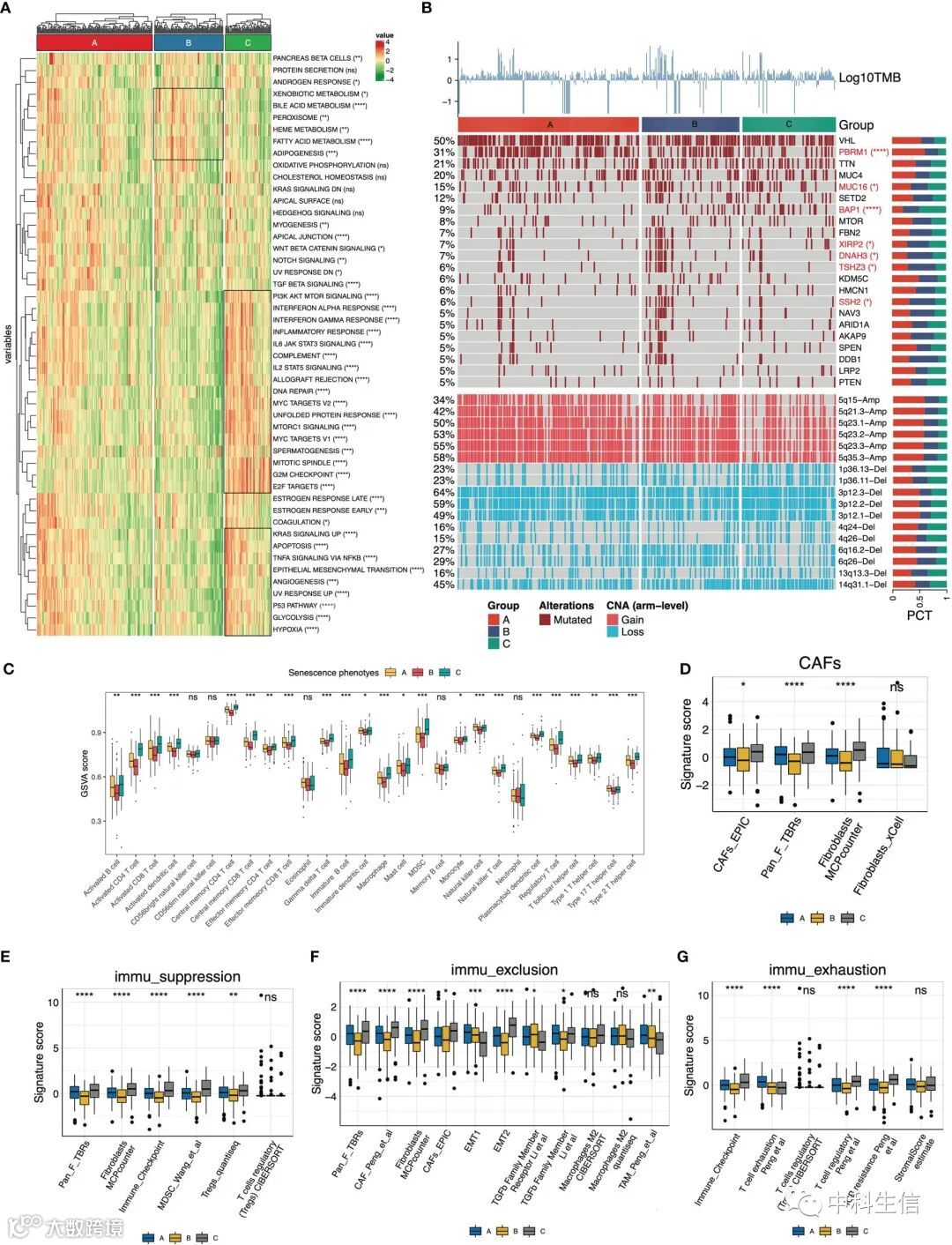随后分析衰老亚型的癌症特征。结果表明,大多数癌症标志在亚型之间存在显着差异分布。在基因组异质性方面,研究差异分布的突变和拷贝数变异(CNV)。随后研究不同亚型的免疫细胞浸润的丰度,发现肿瘤内免疫细胞浸润的丰度随着衰老程序的激活而增加。