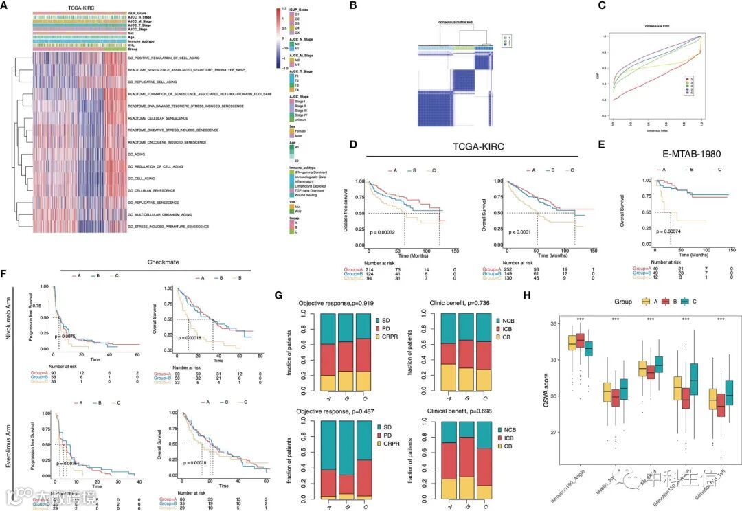 为了更好地了解 ccRCC 中的衰老表型,我们基于与衰老相关的 GO/Reactome 术语的活动进行了无监督的共识聚类。使用t-SNE观察在三个集群之间的分布。