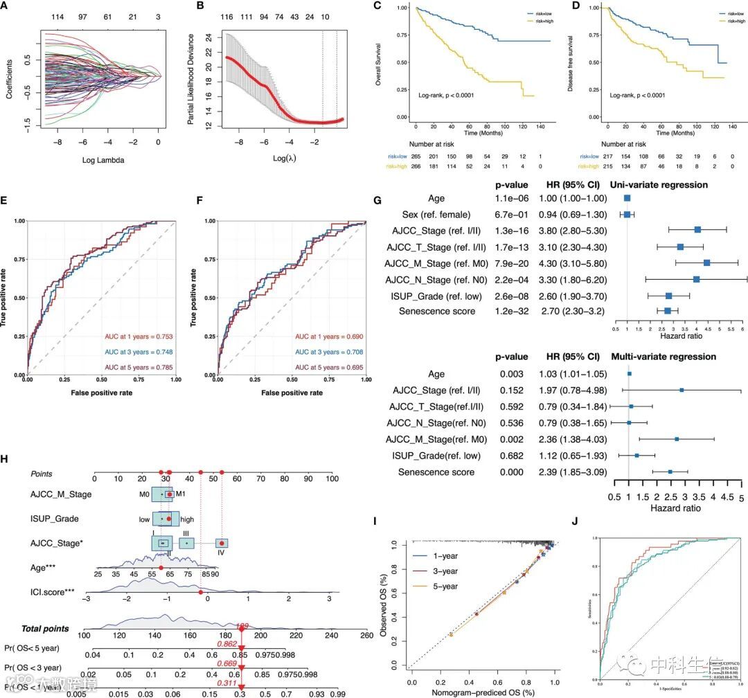 使用lasso构建一个衰老的预后模型。使用ROC曲线验证衰老的预后模型的1、3 和 5 年的AUC值。同时构建列线图以及在其他数据集进一步测试了衰老评分对患者预后的预测价值。