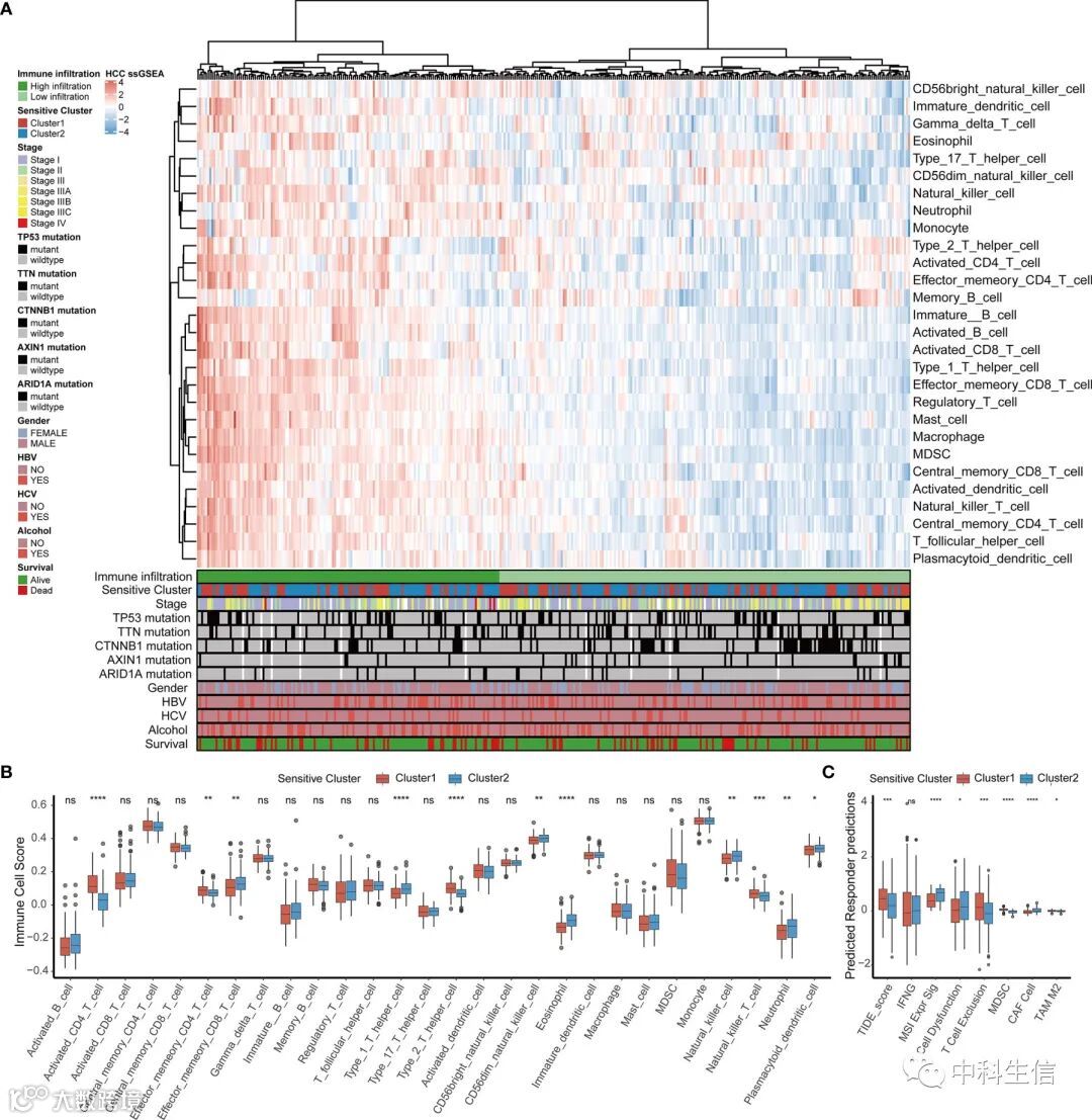 使用来自 TCGA-LIHC 数据集的基因组数据分析了两个集群中体细胞突变的分布,选取CTNNB1 (HCC 中常见的治疗抗性基因)和TP53(HCC 的主要驱动基因)比较两个簇之间突变差异。随后使用ssGSEA 选择了基质 TME 的几个标志物进行比较不同簇间的差异。
