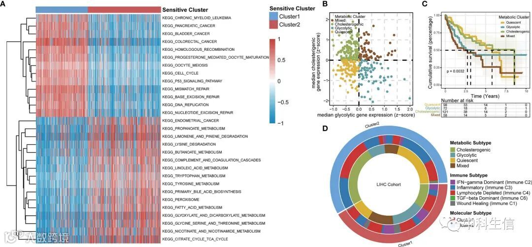 基于 GSVA 对 TCGA-LIHC 数据集的富集分析,选取糖酵解和胆固醇生成等基因集,使用它们将 HCC 分为四种代谢亚型:静止、糖酵解、胆固醇生成和混合型。