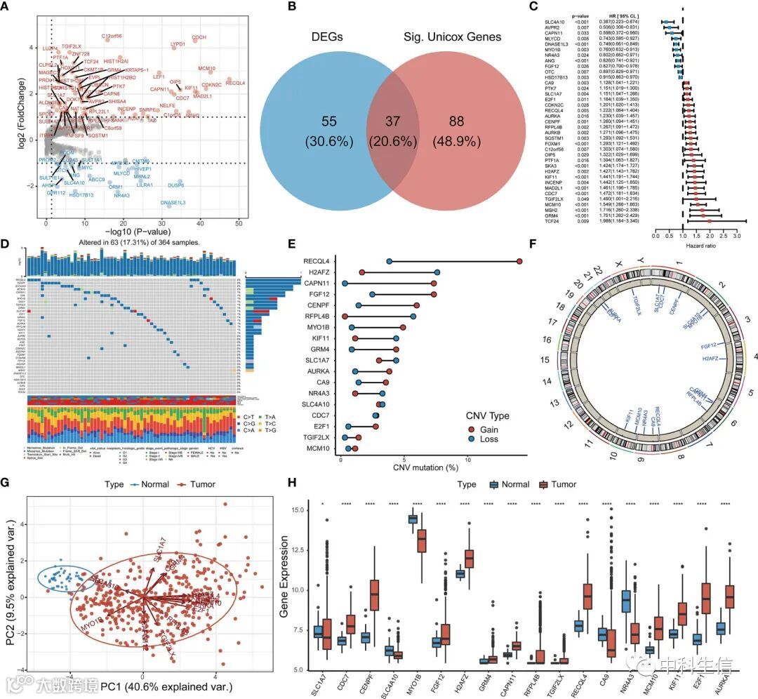 通过差异分析 的GSTTKs基因和单变量 Cox 回归分析选取TCGA-LIHC与 HCC 预后有关的GSTTKs基因取交集,然后选取突变频率 > 1%和HR>1的进行后续分析。