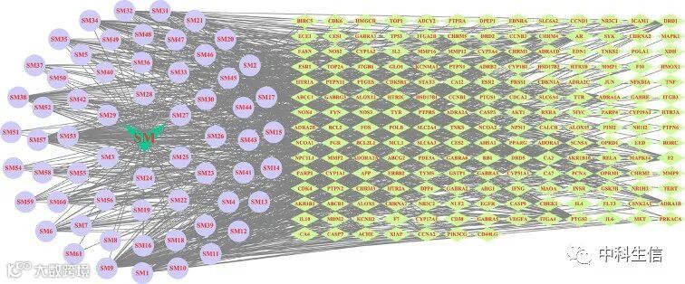 2、利用TCMSP和SwissTargetPrediction数据库获取SM活性成分的靶点,并构建活性成分-靶点网络;