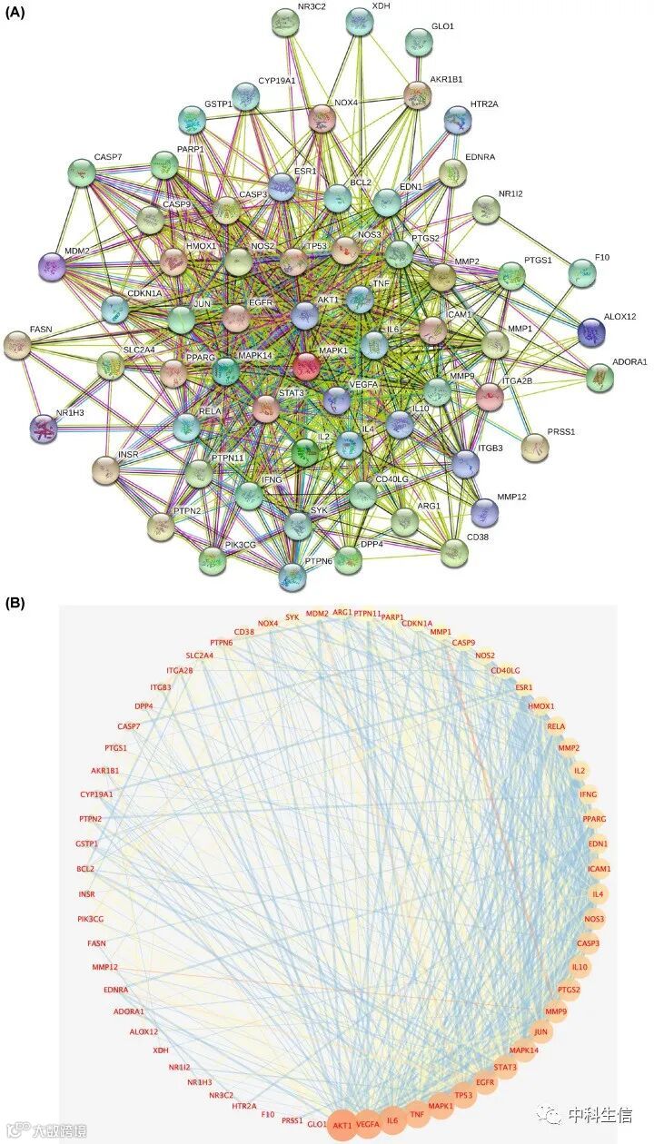 使用STRING数据库构建PPI网络(图4A),网络包括64个节点和704个边。使用Cytoscape软件统计网络图中的节点的degree(图4B),排名前10的是AKT1、VEGFA、IL6、TNF、MAPK1、TP53、EGFR、STAT3、MAPK14和JUN。