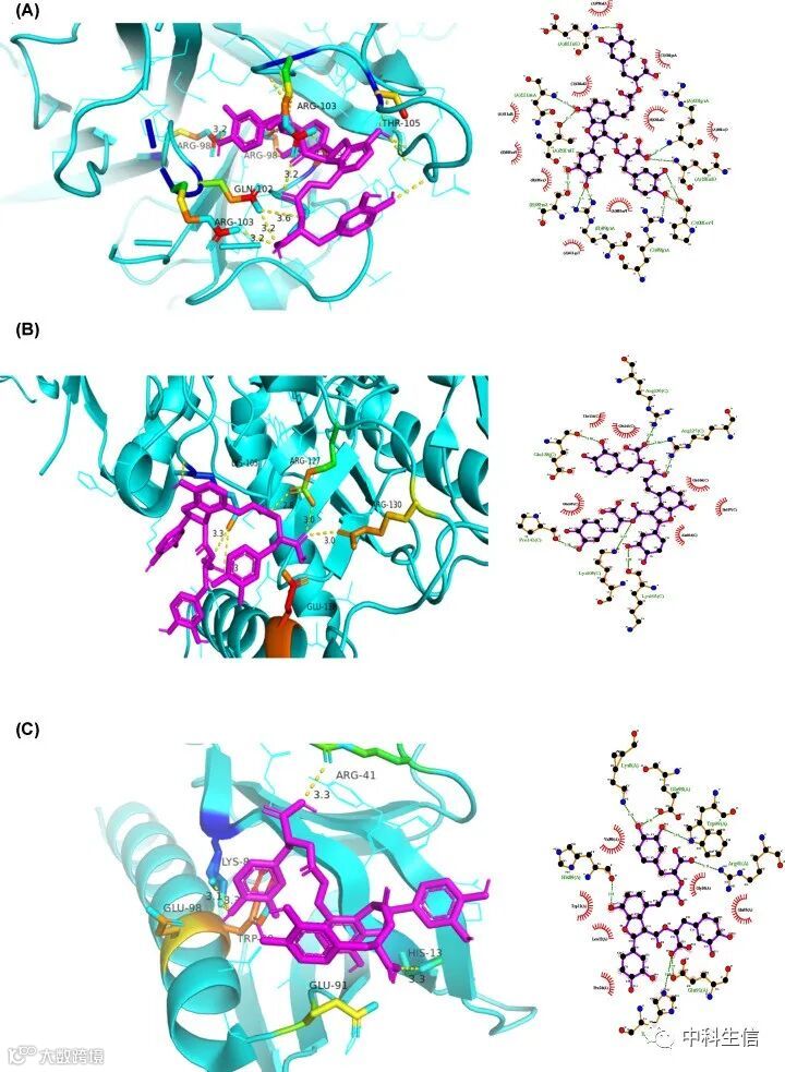 挑选salvianolic acid B分子对接中能量值最低的几种靶蛋白,包括TNF、NOS2和AKT1,结合能分别为–9.3、–6.6和–6.4 kcal/mol(图7)。这表明丹salvianolic acid B对这些靶点具有良好的结合能力。