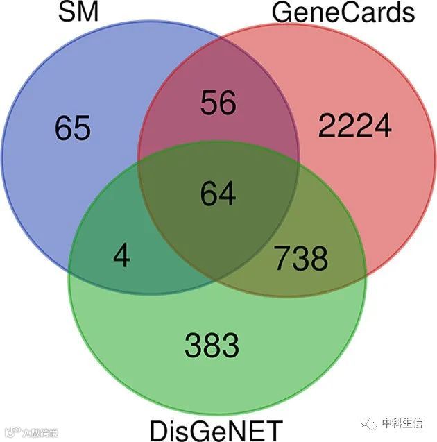 SM活性成分的189个靶点以及1189、3084 个DN相关靶点取交集,得到64个药物-疾病靶点(图3) 。
