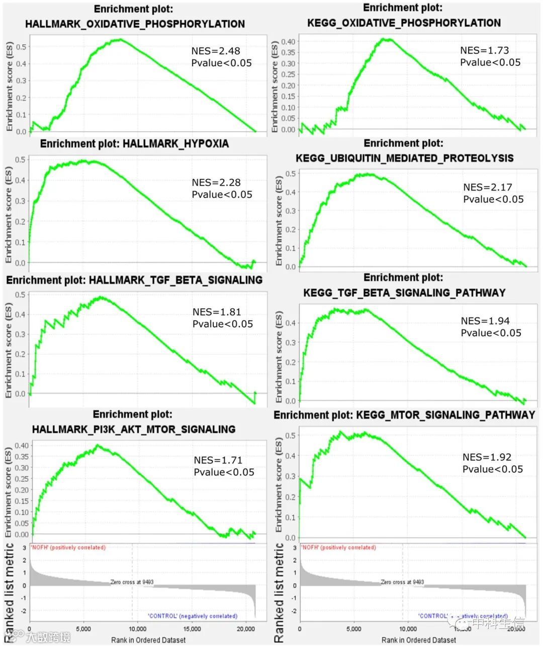 将440个可匹配到数据集GSE74089氧化应激相关基因(OS-gene)的表达数据上传至GSEA软件,利用Hallmark和KEGG基因集数据库对OS-genes进行富集分析。结果表明,大部分上调基因参与了氧化磷酸化、缺氧、TGF-β信号、PI3K-AKT-mTOR信号和泛素介导的蛋白水解,如图3所示.