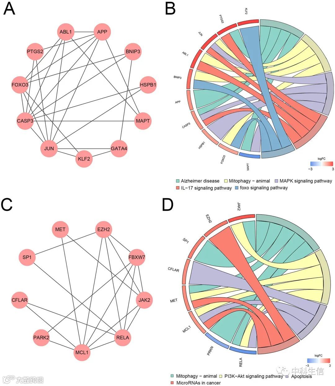 MCODE插件筛选出2个关键模块(图6A、C),KEGG分析显示,第1个模块主要富集于阿尔茨海默病、mitophagy-animal、MAPK信号通路、IL-17信号通路、FOXO信号通路(图6B),第2个模块主要集中在mitophagy-animal、PI3K-Akt信号通路、细胞凋亡、癌症通路中的 microRNAs(图6D)。