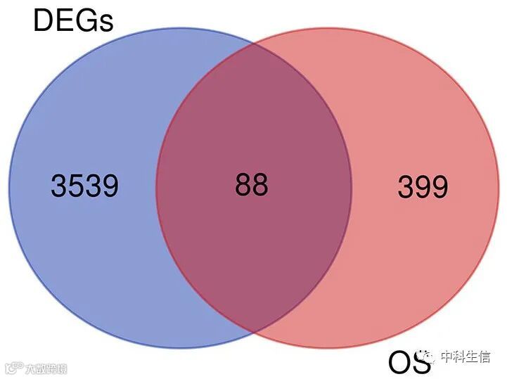 从GO数据库中共筛选出488个氧化应激相关基因。韦恩图显示(图2),DEGs和氧化应激相关基因之间共得到88个交集基因,其中上调基因71个,下调基因17个。