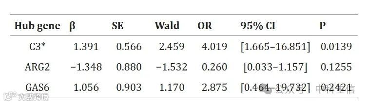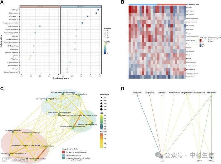 然后,对逻辑双向消除回归中p值<0.05的基因进行了GSEA分析,以了解其潜在的生物学作用。C3的GSEA的气泡图显示(Fig 10A),表现出高表达的基因在同种异体移植物排斥反应、通过NFkB的TNFA信号传导和KRAS信号传导上行途径中富集,相反,表达降低的基因在与E2F靶点、G2M检查点和MYC靶点V1相关的途径中显著富集。使用R包GSVA的单个样本中途径富集的程度显示(Fig 10B),在C3组的高水平表达中,P53通路、细胞凋亡和通过NFkB通路的TNFA信号传导显著富集。随后,下载了人类KEGGpathway数据,根据KEGG类别,使用R包clusterProfiler和enrichplot对C3单基因富集分析的结果进行聚类,以找到相关途径的共性,并计算每个聚类的平均值和标准差,P值<0.05具有统计学意义。集群内的中心途径是Th1和Th2细胞分化、TNF信号传导以及病毒蛋白与细胞因子和细胞因子受体的相互作用(Fig 10C)。此外,通过CTD评估了治疗EM的潜在治疗药物。结果显示,筛选出7种药物,即布洛芬、达那唑、吲哚美辛、米非司酮、孕酮、白藜芦醇和罗非昔布,其中6种药物靶向C3,3种药物靶向GAS6,2种药物靶指向ARG2。据推测,它们可以逆转或诱导hub基因的表达,从而影响EM的状态(Fig 10D)。
