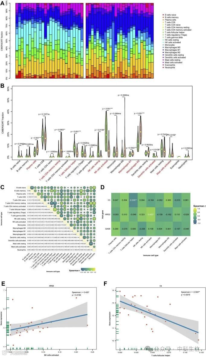 在这项研究中,CIBERSORT算法用于估计26个在位和26个异位子宫内膜样本中22个免疫细胞的比例(Fig 8A)。在位和异位子宫内膜样本中的免疫细胞浸润的差异显示(Fig 8B)。与在位子宫内膜相比,异位子宫内膜M2巨噬细胞(p<0.001)、浆细胞(p<001)、CD4记忆性T细胞(p>0.01)和树突状细胞(DC,p<0.05)的比例显著增加。相反,T卵泡辅助细胞(Tfh,p<0.001)、活化的自然杀伤细胞(NK)(p<0.001),静息的NK细胞(p<0.05)和活化的树突状细胞(DC)(p<0.05)的比例显著降低。各种类型的免疫细胞之间的关系被展示(Fig 8C)。接下来,进一步分析了诊断生物标志物与免疫细胞浸润水平之间的相关性。结果显示,hub基因与一个或多个细胞在免疫浸润中的功能相关(Fig 8D),这表明诊断生物标志物可能对免疫微环境产生重大影响。其中,C3和Tfh细胞之间存在极显著的负相关,而ARG2与NK细胞表现出显著的正相关(Fig 8E、Fig 8F)。