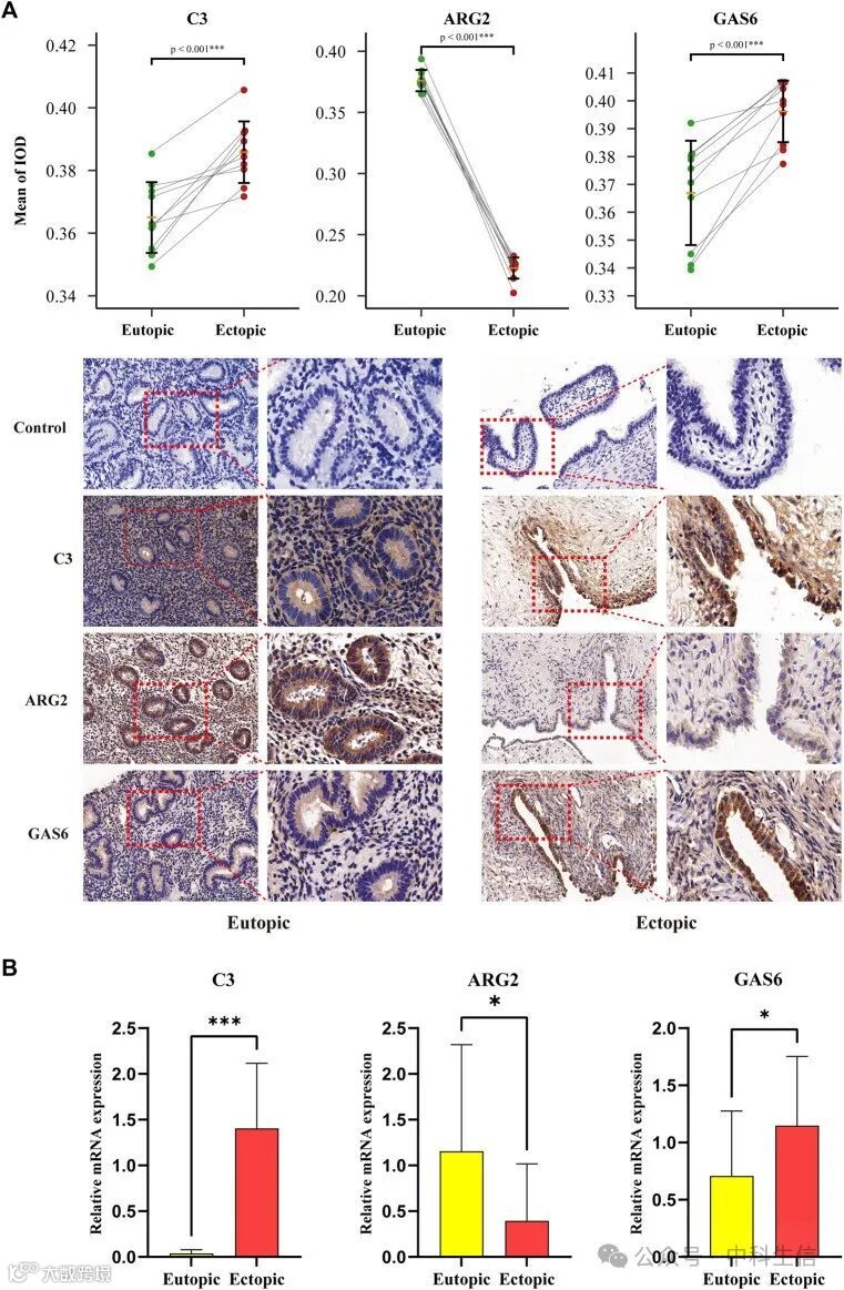 对10对匹配的在位和异位子宫内膜组织样本进行qRT-PCR和IHC,以验证三种诊断生物标志物的表达水平。使用抗C3、抗GAS6和抗ARG2的EM组织的IHC染色显示,与在位子宫内膜相比,异位子宫内膜中C3和GAS6的表达较高,ARG2的表达较低,差异具有统计学意义(Fig 11A)。同时,qRT-PCR结果显示,与在位子宫内膜相比,异位子宫内膜中C3和GAS6的表达更高,ARG2的表达更低,差异具有统计学意义(Fig 11B)。