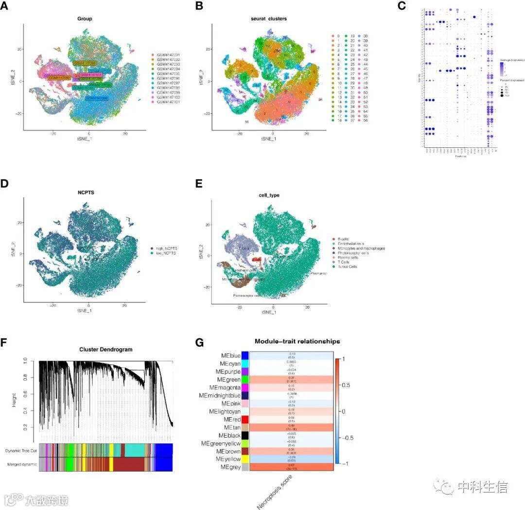 作者首先分析了UVM的单细胞测序数据集GSE139829,以整合不同的样本。如图2A所示,11个样本之间的整合效果良好,没有明显的批次效应,可用于后续分析。然后我们通过k-Nearest Neighbor(KNN)聚类算法将所有细胞聚成57个聚类(图2B,C)。然后用 "PercateFeatureSet "函数输入68个与坏死相关的基因,最后得到每个细胞中坏死基因的百分比。按坏死基因比例的中位数将细胞分为低坏死和高坏死细胞,并以tSNE图显示(图2D)。然后,根据不同细胞类型的表面标记基因,作者观察它们在不同集群中的表达(图2C),最终确定了7种细胞类型。分别是B细胞、内皮细胞、单核细胞和巨噬细胞、光感细胞、浆细胞、T细胞和肿瘤细胞(图2E)。然后,作者分析了高颈椎病组和低颈椎病组之间的差异表达基因,结果发现了3673个基因