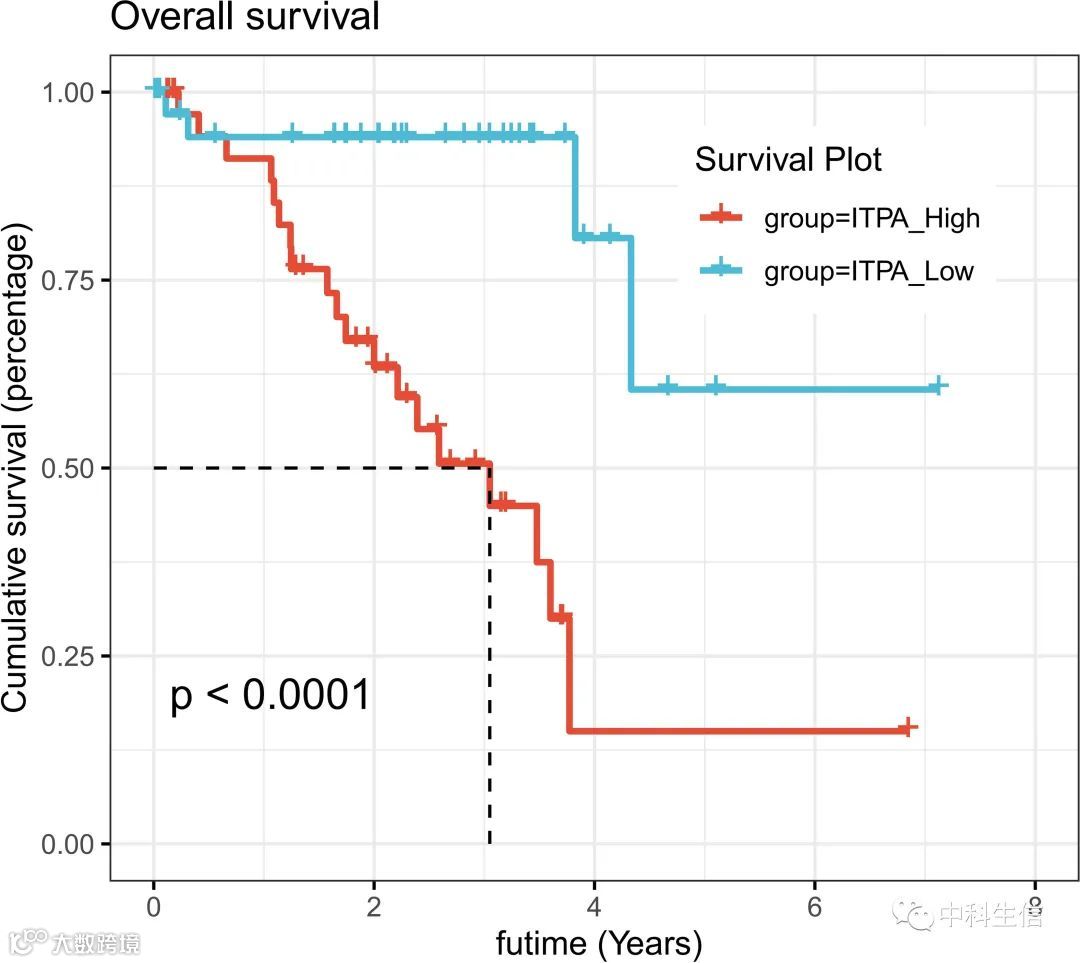 在COX回归和Lasso回归分析中,ITPA的HR值最高,所以作者进一步对ITPA进行生存分析。结果显示,ITPA高表达的患者的预后明显比ITPA低表达的患者差(P<0.001,图7)。