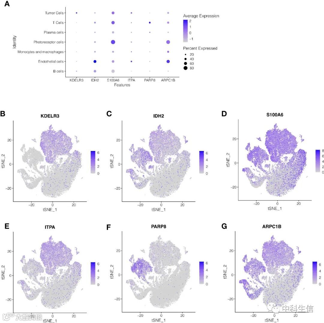 作者进行了单细胞测序分析,探索建模基因在不同细胞类型中的表达。如图5A-G所示,KDELR3主要在肿瘤细胞中表达,IDH2主要在内皮细胞中表达,S100A6主要在光感受器细胞中表达,ITPA主要在内皮细胞和肿瘤细胞中表达,PARP8主要在T细胞中表达,APRC1B主要在内皮细胞中表达。