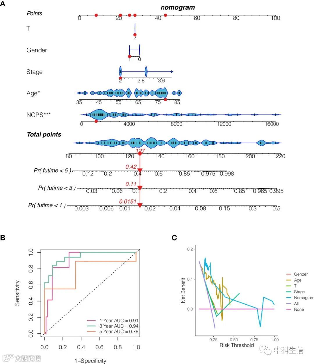 为了更好地评估UVM患者的风险,作者结合临床数据和NCPS值构建了一个列线图。如图6A所示,根据患者 "TCGA-VD-AA8R "的性别、年龄、T分期、总分期和NCPS评分,该患者在1、3和5年内的死亡率估计为0.015、0.11和0.42。该列线图可以更好地评估患者的风险并指导后续的临床决策。为了进一步评估该列线图的准确性,进行了预后ROC分析。结果显示,1、3、5年的曲线下面积(AUC)分别为0.91、0.94和0.78(图6B)。作者还进行了决策曲线分析,即通过计算每个临床特征和None的横轴的面积来评估临床决策价值。结果显示,该列线图的效果优于其他临床指标,说明该列线图在预测患者预后方面有良好的效果,可以指导临床决策(图6C)。
