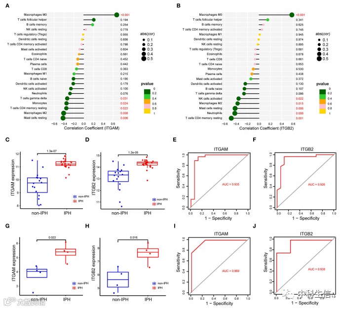 (图6A、B)hub基因(ITGAM、ITGB2)与浸润免疫细胞之间的相关性。(图6C,D)数据集 GSE163154 中 IPH 和非 IPH 样本之间两个基因的表达水平。(图6E,F) ROC 曲线,用于评估数据集 GSE163154 的逻辑回归分析的准确性。(图6G,H)验证数据集 GSE120521 中 IPH 和非 IPH 样本之间两个基因的表达水平。(图6I,J)用于评估验证数据集 GSE120521 的逻辑回归分析准确性的 ROC 曲线。