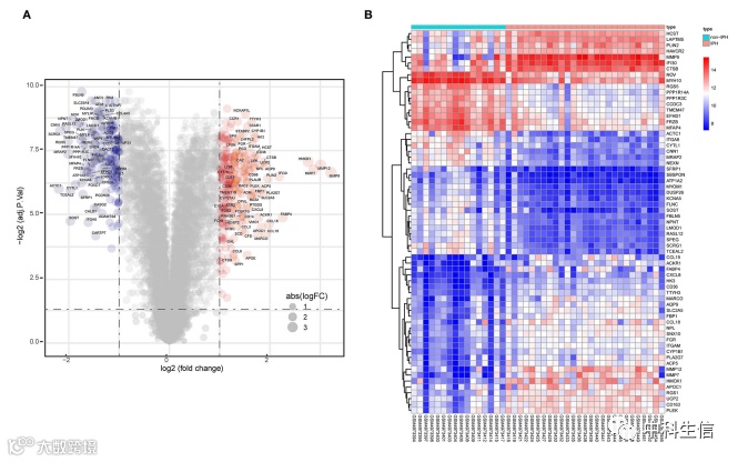 鉴定非IPH样品和IPH样品之间的 DEG(图2)。(A)火山图显示了使用 R 软件分析 GSE163154 数据集后非IPH组和IPH组之间的 DEG。(B)显示两组之间 DEG 的热图。