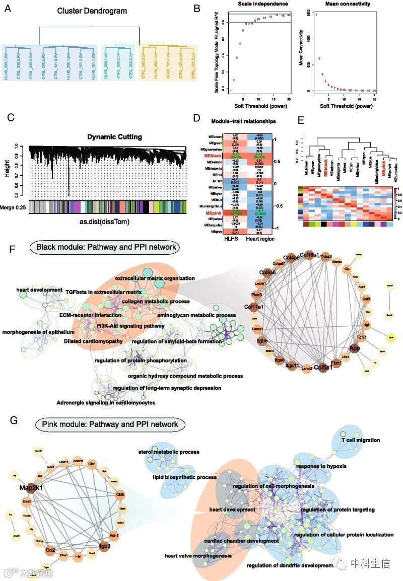 如图3A所示,没有异常样本。将软阈值(β)设置为8 (图3B),将具有相似表达模式的DEG分配到一个模块中(图3C),最后得到了16个共表达模块。基因谱与样本性状之间的相关性如图3D所示。黑色和粉色模块被认为与HLHS进展最相关。黑色模块中有249个基因,粉红色模块中有222个基因。图3E显示了不同模块之间的关系。 KEGG结果显示黑色模块中的基因主要富集在细胞外基质中的 TGFβ、胶原代谢过程、ECM 受体相互作用、PI3K-Akt 通路和扩张型心肌病,尤其是细胞外基质组织(图3F)。细胞外基质组织途径中的基因被用来进行PPI网络。我们发现Fbn1、Thbs2、Itga8、Itga11和Itgb5可能是HLHS的中心基因。对于粉色模块中的基因,心脏发育、心脏瓣膜形态发生和心腔发育是最显着富集的途径(图3G)。3条通路基因中,通过PPI鉴定出Map2k1、Ccl2、Itgb3、Edn1和Cblb 5个基因。