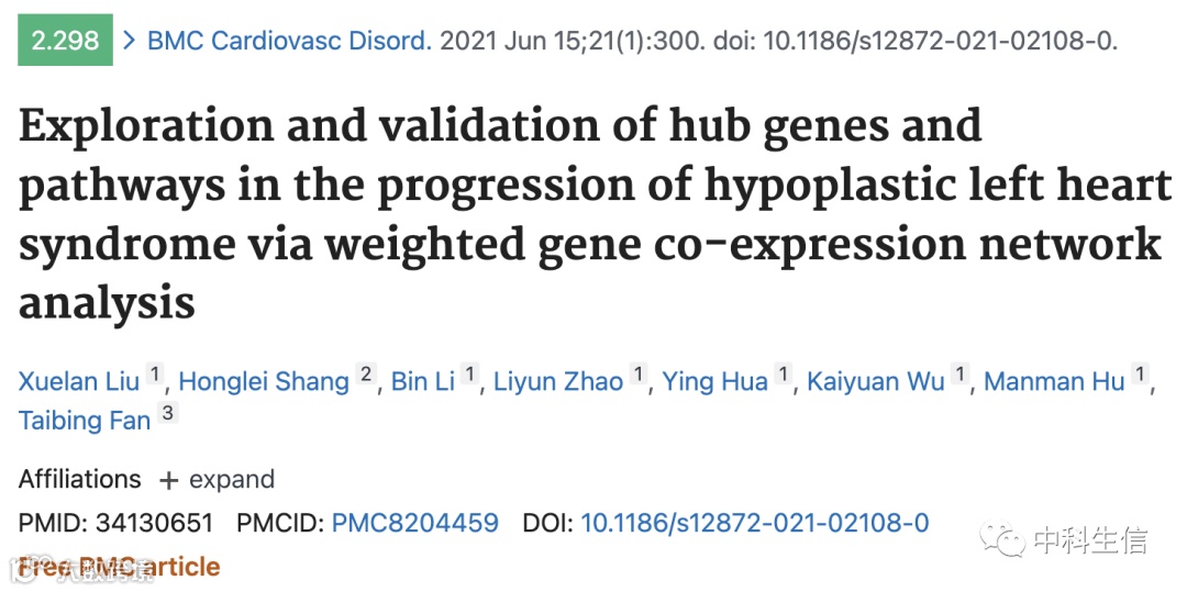 早上好,今天分享一篇2021年6月发表在BMC Cardiovasc Disord(IF=2.298)的文章(Ref:34130651),作者研究的是左心发育不良综合征进展中的hub基因和关键途径。该研究方法同样适用于其他肿瘤或非肿瘤的研究,有相关需求的老师欢迎联系我们!