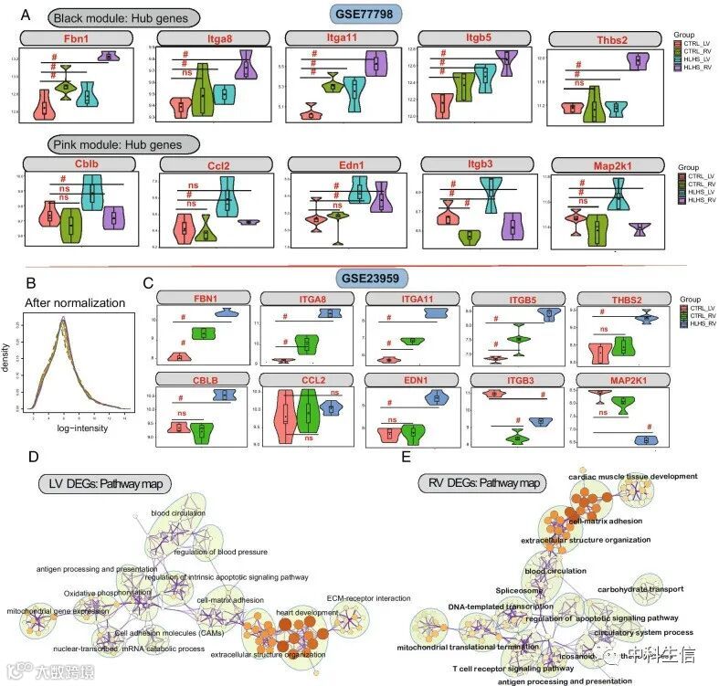 GSE77798数据集中,黑色模块和粉色模块中的hub基因表达模式如图4A所示。这些hub基因的表达模式在GSE23959数据集中得到进一步验证(图4c)。利用GSE23959数据集对所有DEG进行KEGG通路富集分析(图4D,E)。