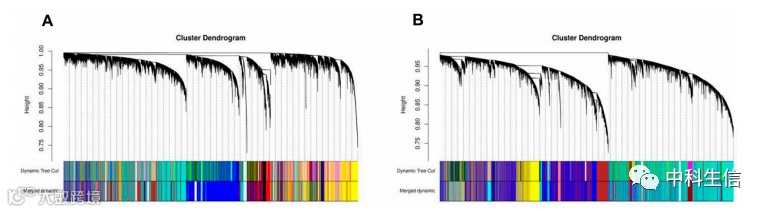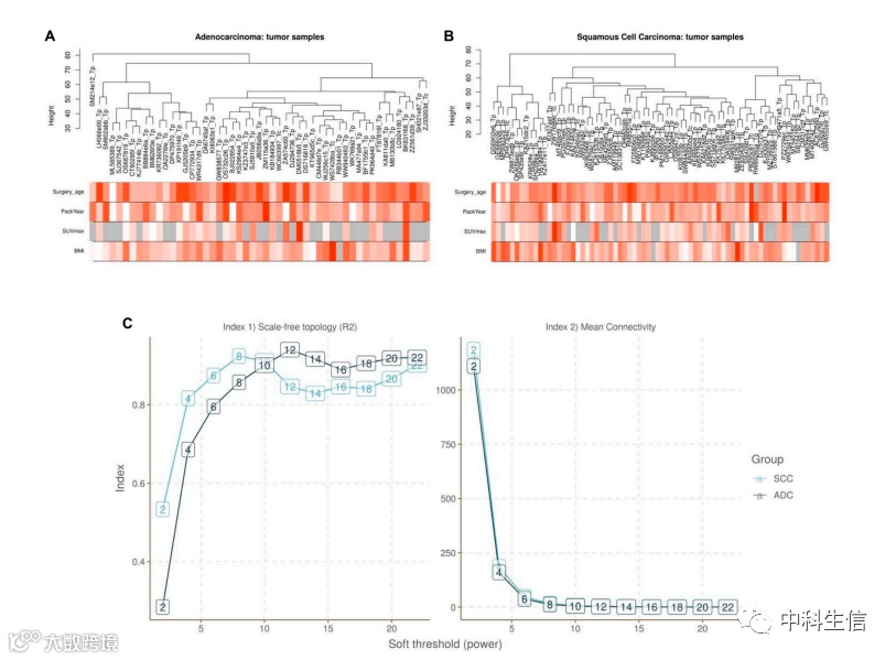 进行 WGCNA 以构建共表达网络并识别共表达模块。ADC 和 SCC样本的聚类分析以检测异常值(图5A-B)。加权基因共表达网络分析(WGCNA)中软阈值的确定(图5C)。ADC 和SCC 肺癌模块中已识别的共表达基因的分层聚类树状图(图6)。每个彩色行代表一个颜色编码的模块,其中包含一组高度连接的基因。在 ADC 和 SCC 中分别确定了 32 个和 15 个模块。SCC 和 ADC的Eigengene 与临床特征之间相关性的热图(图7)