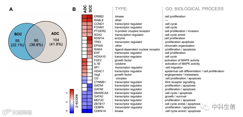 IPA 预测的 SCC 和 ADC 中基因表达的前 20 个上游调节因子(图4)。( A ) 显示在激活或抑制的调节器中,只有 90 个在 SCC 和 ADC 之间重叠。(B)热图显示了 IPA 中分类分子的预测激活和抑制状态,如转录调节因子、生长因子、细胞因子、激酶等。