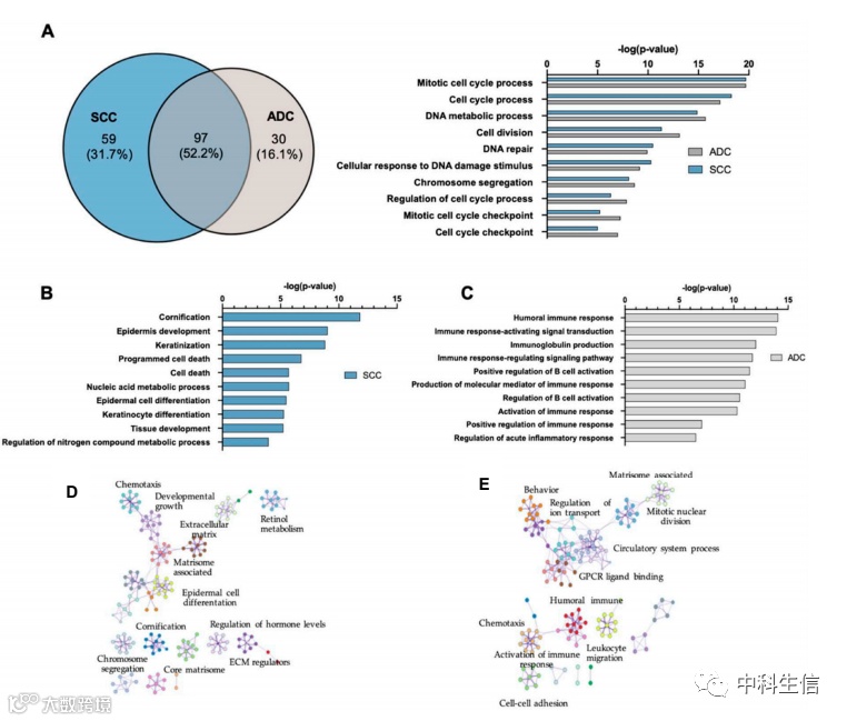 基因本体(GO)术语分析(图2)。( A ) 显示鳞状细胞肺癌 (SCC) 和腺癌 (ADC) 中差异表达 (FDR ≤ 0.01) 的 GO 生物过程 (BP) 的数量以及这两种非小细胞肺癌亚型之间重叠 GO 术语的数量的维恩图. (B)仅在 SCC 与正常组织中发现的前 10 个 GO 术语。(C)仅在 ADC 与正常组织中确定的前 10 个 GO 术语。(D)使用 Metascape 工具仅在 SCC与正常组织中识别的富集术语网络。( E ) 使用 Metascape 工具仅在 ADC 与正常组织中识别的丰富术语网络。使用 IPA确定的与 SCC 和 ADC 相关的最具代表性的改变的规范途径(图3)。( A ) 维恩图显示鳞状细胞肺癌 (SCC) 和腺癌 (ADC) 中典型通路的数量,以及这些通路在这两种 NSCLC 亚型之间的重叠。(B)仅在 SCC 与正常组织中发现的前 10 种典型途径。( C ) 仅在 ADC 与正常组织中发现的前 10 种典型途径。