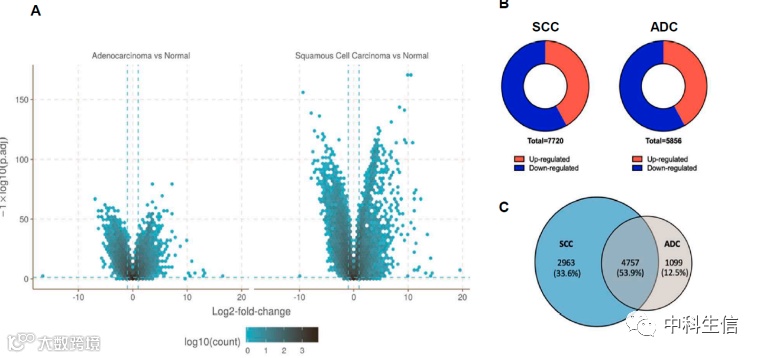 鳞状细胞癌 (SCC) 和腺癌 (ADC) 中的差异基因表达(图1)。( A ) 非小细胞肺癌 (NSCLC) 各亚型中差异表达基因 (DEG) 的火山图。(B)饼图代表发现的上调或下调的基因数量。(C)维恩图显示 SCC 和 ADC 中差异表达基因之间的重叠。