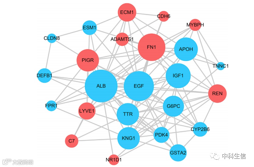 STRING 工具用于构建基于 DEG 的 PPI 网络。使用 Cytoscape 软件可视化 PPI 网络模型(如图 4)