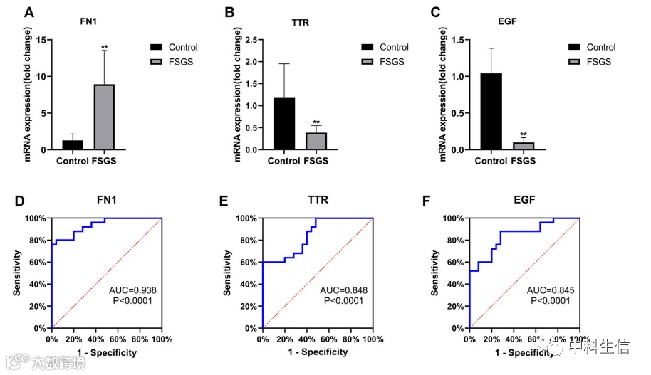 为了验证生物信息学分析的结果,通过 qRT-PCR 分析了 FSGS 和正常肾组织中hub基因的表达。与生物信息学结果一致,FSGS 组织表现出 FN1 表达上调(图 5A) 和 TTR 的下调表达 (图 5B) 和 EGF (图 5C) 与正常组织相比。进行 ROC 曲线分析以研究这些基因作为 FSGS 生物标志物的准确性,如图所示图 5。
