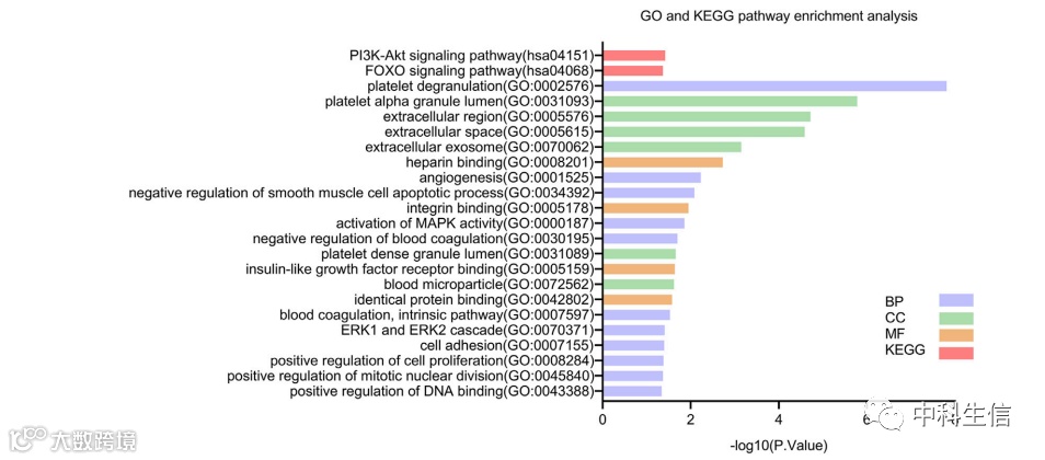 接下来,我们探索了这些 DEG 的可能功能以及受影响的信号通路。使用 DAVID 对 DEG 进行 GO 功能和 KEGG 通路富集分析的结果,结果显示在图 3.