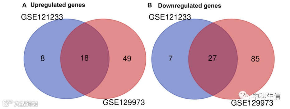 绘制维恩图以选择两个数据集中的共同 DEG(如图 2)。结果表明,在两个数据集中,45个基因的表达发生了显着变化,其中18个基因显着上调,27个基因显着下调。