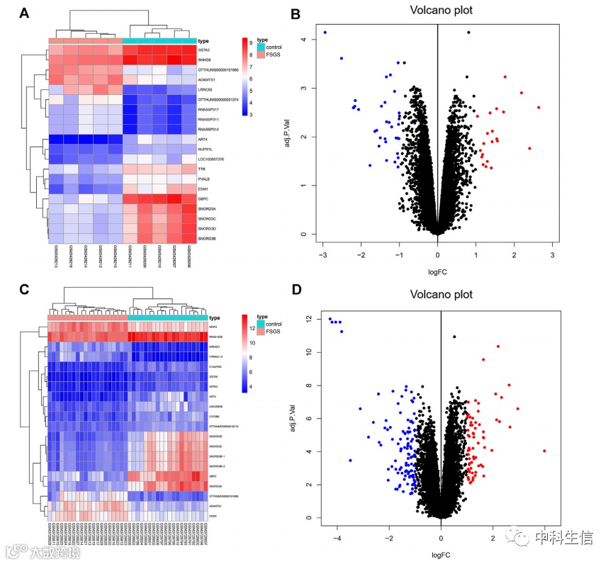 GSE121233 DEG的热图(图1A)和火山图(图1B)。GSE129973 DEG的热图(图1C)和火山图(图1D)。