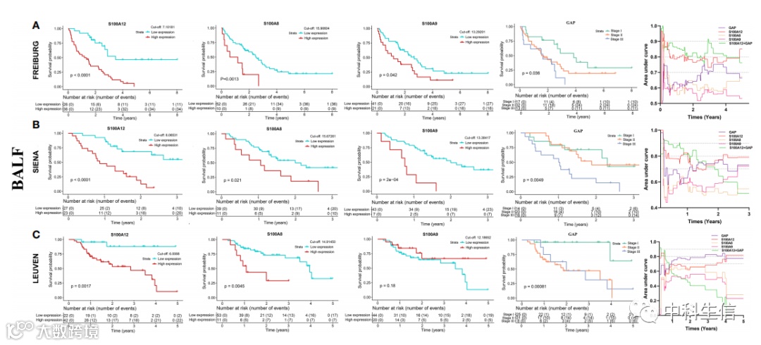 图6.根据GSE70866数据集进行K-M分析及S100A12、S100A8、S100A9和GAP指数对IPF患者BALF生存期的预测价值。