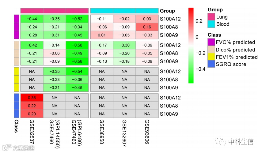 在GSE32537数据集(肺组织,图4)中,S100A12、S100A8和S100A9与FVC%预测值和Dlco%预测值显著负相关,与SGRQ评分显著正相关。GSE47460数据集(肺组织)由两个平台组成:GPL14550和GPL6480。这两个队列证实了S100A12与肺功能显著负相关,并发现这3个基因也与预测的FEV1%显著负相关(图4)。然而,在血液数据集中,S100A12与肺功能不存在显著相关(图4)。S100A12与S100A8、S100A9的相关性更显著。