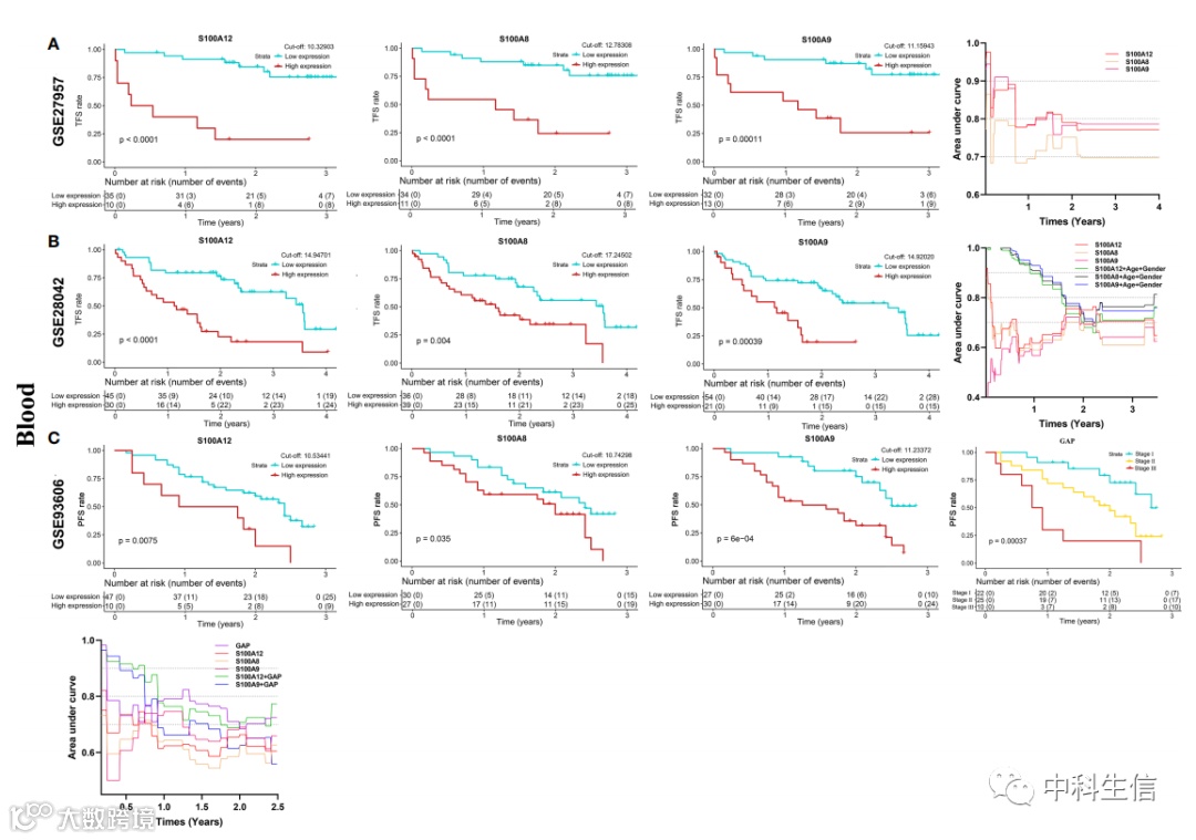 图5.K-M分析及S100A12、S100A8、S100A9和GAP指数对IPF患者血液中TFS和PFS的预测价值。