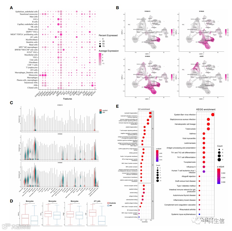 选择两个scRNA-seq数据集[GSE135893 (IPF = 12, control = 10)和GSE122960 (IPF = 4, control = 4)]。S100A12和AGER主要在单核细胞和肺泡上皮1型细胞(AT1细胞)中高表达(图8A-C)。S100A8和S100A9主要在单核细胞和巨噬细胞中表达(图8A-C)。NFKB1主要在树突状细胞中表达,SAA1主要在BPIFB1+/MUC5B+俱乐部细胞中表达,PPARG主要在肺泡巨噬细胞(AMs)中表达(图8A)。此外,IPF患者的单核细胞中S100A12、S100A8、S100A9的表达显著下调,AT1细胞中AGER的表达也显著下调(图8D)。有趣的是,S100A8和S100A9在IPF巨噬细胞中表达上调。根据对IPF患者和对照组中S100A12 >单核细胞的DEGs进行的GO和KEGG分析,IPF患者中S100A12 >单核细胞可能与抗原加工和呈递更相关(图8E)。有趣的是,在GSE135893数据集中观察到单核细胞的过渡状态,在IPF患者中过渡单核细胞S100A12的表达下调(图8C)。