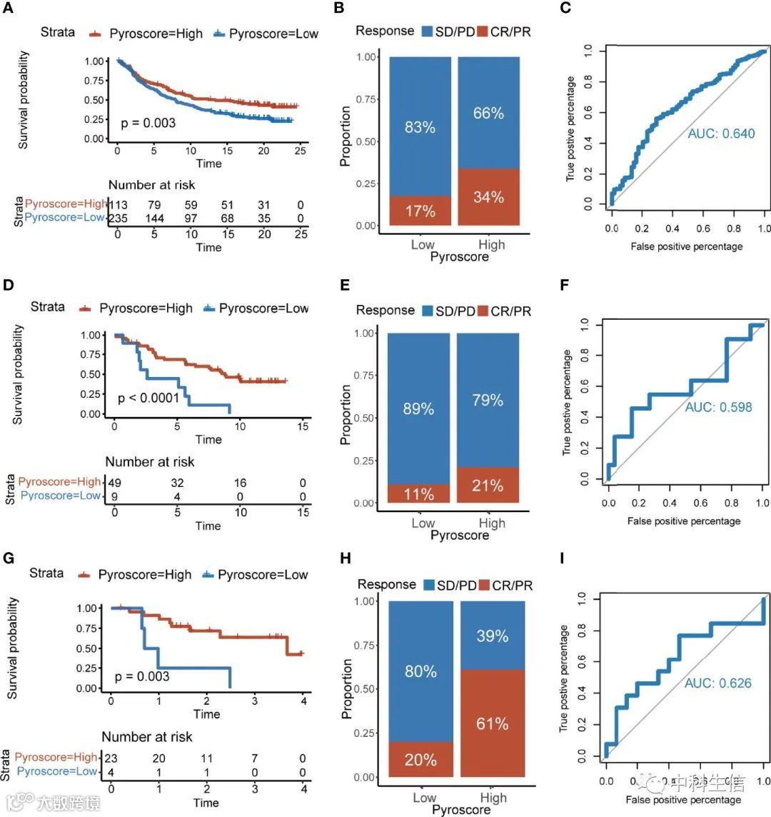 ICB 疗法已在癌症中显示出令人兴奋的临床结果,我们之前的结果显示了强有力的证据表明高 pyroscore 患者更有可能从 ICB 疗法中受益。我们决定使用外部队列进一步探索 pyroscore 与 ICB 治疗益处之间的关系。共收集了四个接受免疫检查点治疗的队列:IMvigor210、GSE91061、GSE78220 和 GSE35640。在 IMvigor210(抗 PD-L1)队列中证明,较高的 pyroscore 与显着更好的预后(对数秩检验,p = 0.003)和对抗 PD-L1 治疗的更好反应(双边 Fisher 精确检验,p = 0.015),表明高 pyroscore 的患者更有可能从 ICB 治疗中受益(图 7A、B )。ROC 曲线还评估并证明了 pyroscore 在预测 ICB 治疗反应性方面的准确性(图 7C,AUC=0.640)。在 GSE91061(抗 PD-1)和 GSE78220(抗 PD-1)队列中发现了相同的结论(图 7D-I)。此外,pyroscore 与 IMvigor210 队列中的免疫浸润表型相关。最后,在 GSE35640(抗 MAGE-A3)队列中,对 ICB 治疗有反应的组的 pyroscore 显着更高。同样,ROC 曲线显示 pyroscore 对免疫治疗益处具有良好的可预测性。总之,我们的数据强烈表明 pyroscore 可以很好地预测对免疫检查点阻断治疗的反应。