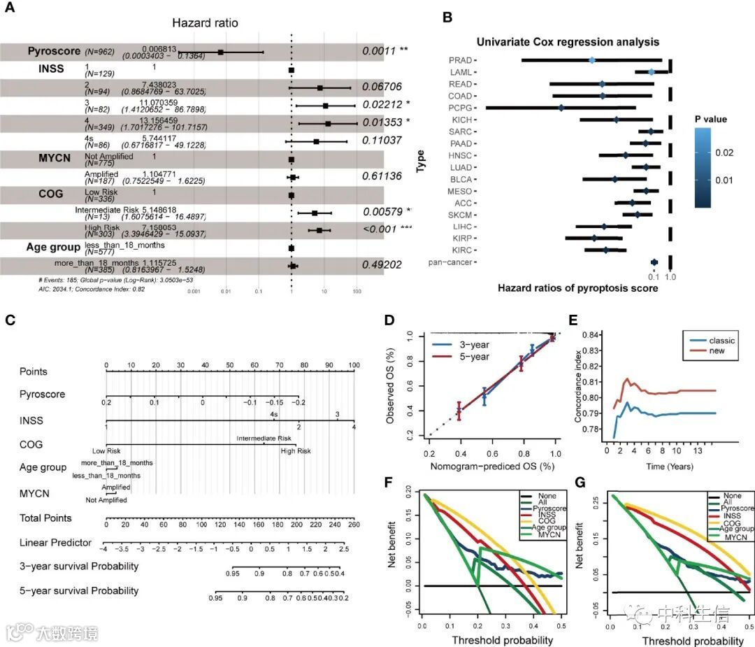 基于 pyroscore 与临床和免疫特征相关,我们试图确定其在作为 NB 独立预后因素中的作用。首先,将单变量 Cox 风险分析应用于 pyroscore、INSS、COG、MYCN、性别和年龄分组。单变量 Cox 分析中p值 <0.05的预后因素包括在多变量 Cox 回归分析中。多变量 Cox 回归的结果表明 pyroscore 是 NB 的重要保护因素(图 5A)。此外,共有 33 种癌症来自癌症基因组图谱 (TCGA) 数据库也用于评估 pyroscore 的有效性和普遍性。pyroscore 对 17 种癌症的预后有显着影响,并且在所有癌症中,pyroscore 作为保护因素发挥作用(图 5B)。为了使新模型更广泛地适用于临床实践,我们构建了一个列线图来预测 NB 患者的存活率(图 5C)。每个患者都被分配了一个综合评分,该评分是通过将列线图中每个变量的相应评分相加来计算的。综合评分和新模型的准确性和临床实用性由 3 年和 5 年校准曲线确定(图 5D)。具有更多时间点的时间相关 C 指数曲线在新模型中也显示出更好的性能(图 5E)。3 年和 5 年的决策曲线分析 (DCA) 显示了每个预测因素提供的净收益(图 5F、G),其中 pyroscore 是一个很好的因素。