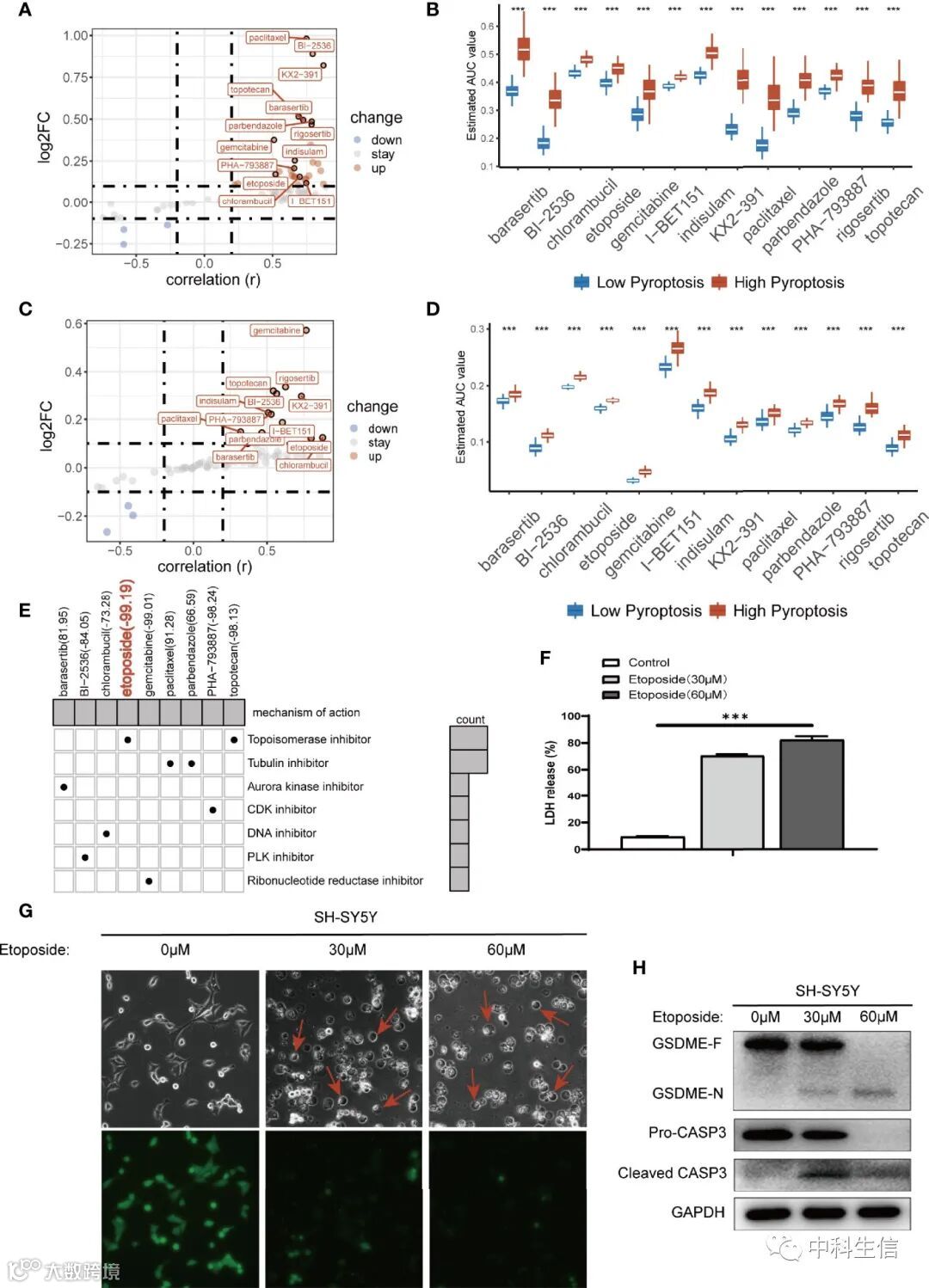 接下来,我们尝试使用 pyroscore 模型寻找对 pyroptosis 表型敏感的药物来指导 NB 患者的临床用药。我们首先使用两个药物敏感性数据库(CTRP 和 PRISM)根据 AUC 值识别候选药物。CTRP 包括 299 种药物,PRISM 包括 1,285 种药物。两个数据库交叉后共筛选出78种药物进行分析。通过相关性和多重变异分析,阈值为 r>0.2 和 log 2 FC>0.1,首先选择了两个数据库中重叠的 13 种药物(图 6A、C),并且在低 pyroscore 中均具有较低的 AUC 值两个数据库组(图 6B,D)。我们进一步利用 CMap 来确定候选药物的性能。CMap 评分与药物的潜在治疗效果呈负相关。六种药物的CMap值均<0,表明它们在低焦核组中具有潜在的诱导细胞焦亡的能力,同时也显示了这些药物的治疗靶点(图6E)。上述结果预测,依托泊苷可能是最有希望诱导 NB 细胞焦亡的药物,尤其是它的 CMap 评分最低。为了验证预测结果,我们用依托泊苷处理人 NB 细胞系 SH-SY5Y 并成功诱导细胞焦亡。LDH释放比例(图6F) 依托泊苷治疗后显着增加。用依托泊苷处理的细胞表现出从质膜和细胞肿胀中出现的大气泡(图 6G)。钙黄绿素-AM 染色测定还证明依托泊苷诱导细胞死亡(图 6G)。通过蛋白质印迹分析,在用依托泊苷处理的细胞中同时检测到 GSDME 的切割和 CASP3 的激活(图 6H)。因此,我们的模型预测的具有低焦焦分数的NB具有诱导焦亡能力的依托泊苷可以在体外诱导焦亡。