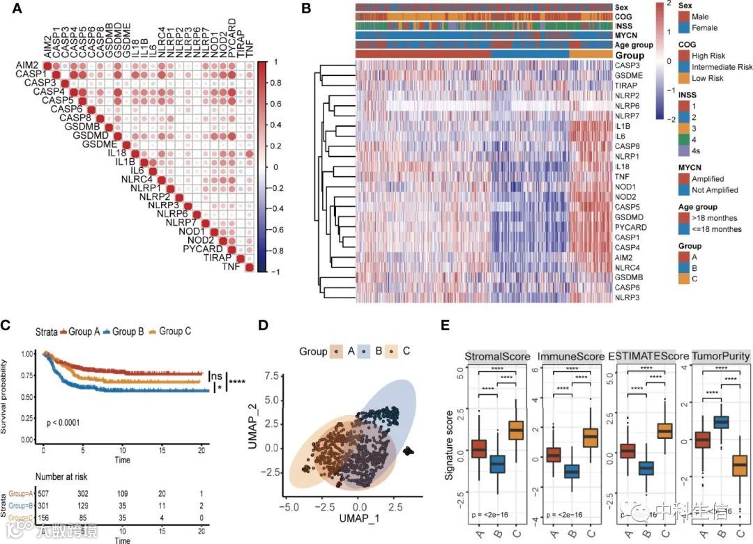 为了评估焦亡作用相关基因是否可以用来预测NB患者的预后,我们共鉴定了24个焦亡作用相关基因。然后我们从四个数据集(TARGET-NB、GSE49710、GSE16476和E-MTAB-8248)中收集了964名NB患者的生存时间数据,形成了一个队列。当24个与焦亡作用相关的基因在数据集中相互对照时,我们发现这些基因之间存在良好的正相关关系(图1A),这表明这些基因可能共同发挥相同的作用。接下来,我们对元队列中24个焦亡相关基因的mRNA表达谱进行了无监督共识聚类,并生成了三组患者(图1B),其中B组的热病相关基因的总体表达量最低。上述确定的三组在生存率上有明显的差异(图1C),B组的生存概率最低。为了进一步探索分子基础和可视化热病相关基因定义的三个组之间的关系,基于前3000个最易变的蛋白编码基因的统一模态近似和投影(UMAP)分析,将样本缩小到二维。结果证实,由焦亡相关基因定义的三个组可以被清楚地区分(图1D)。