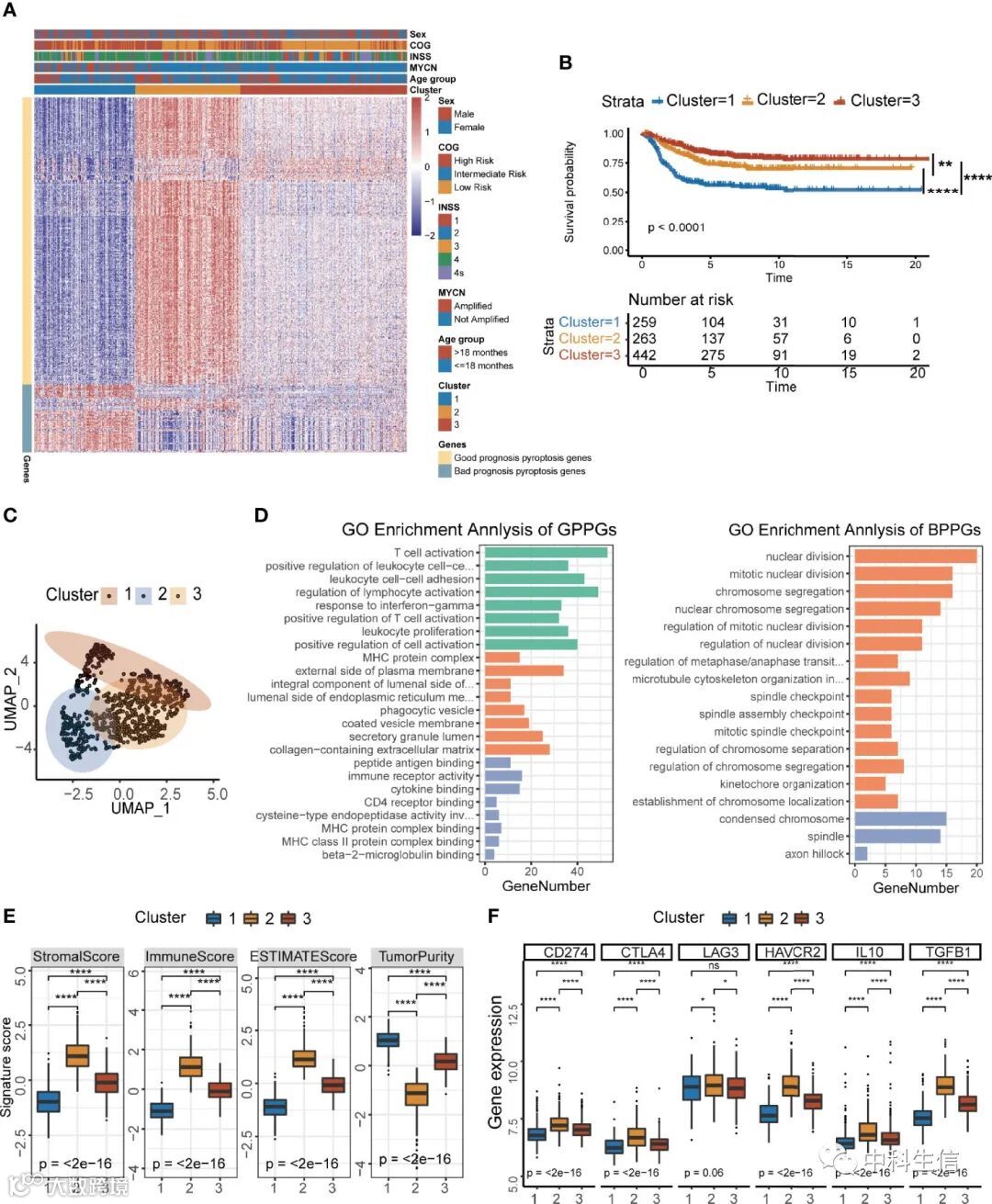 为了系统地解释GPGs和BPPGs的生物学功能,用clusterProfiler R软件包进行GO分析,与预后较好的簇 2 和簇 3 呈正相关的 GPPGs 主要富集于免疫相关通路,尤其是 T 细胞的活化和抗原加工和呈递(图 2D)。群组2被描述为 "免疫衰竭 "表型(35),因为它表现出最高的淋巴细胞浸润;然而,对T细胞衰竭至关重要的分子,包括PDCD1(PD-1)、CD274(PD-L1)、CTLA4和LAG3的表达也更高(图2F)。